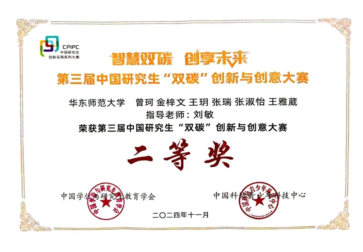 2024年11月22-24日,第三届中国研究生“双碳”创新与创意大赛决赛在武汉理工大学举行。成人用品 由刘敏老师指导,曾珂领队,金梓文、王玥、张瑞、张淑怡、王雅葳同学参与的《城市绿意寻踪:探索生态人文视角下的城市生态空间价值实现之旅——以上海市闵行区吴泾镇为例》项目荣获全国二等奖。由陆雪琴老师指导,衡世亮领队,吴鑫涛、孙一波同学参与的《“光”“铁”妙用—高效去除抗生素铁基光催化剂的构筑同步耦合生物膜反应器产甲烷装置的研发》项目荣获全国三等奖。