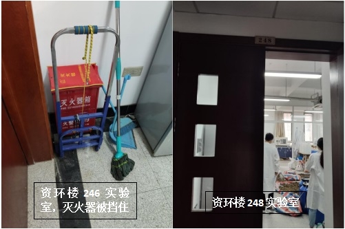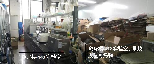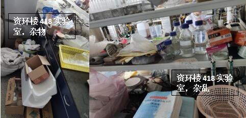 本次检查中几乎所有学生办公室和实验室都存在着大大小小的安全隐患,其中最差学生办公室为生科辅楼一楼113室(甄广印、徐娟、邓杰、蔡永立、韩骥、刘敏学生),最差实验室为生科辅楼112室(甄广印、徐娟、邓杰学生)。检查中发现最普遍的问题是堆放杂物,其他明显的问题有接线板乱拉乱放、做实验穿着不当、办公室使用微波炉等。希望老师和同学们认识到安全问题的严重性,多加重视与防范,发现问题及时改正!