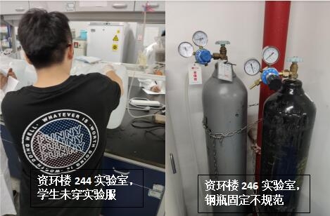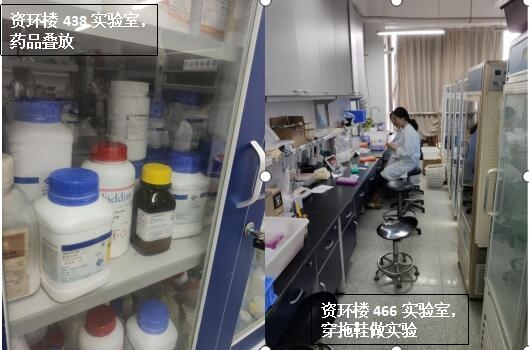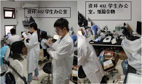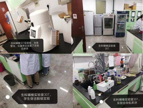 在本次检查的实验室中,生科辅楼307-309室情况最佳,生科辅楼112室情况最差。小卫士们总结发现,实验室的评分除了整洁程度影响外,也受实验人员穿着、操作是否规范的影响。