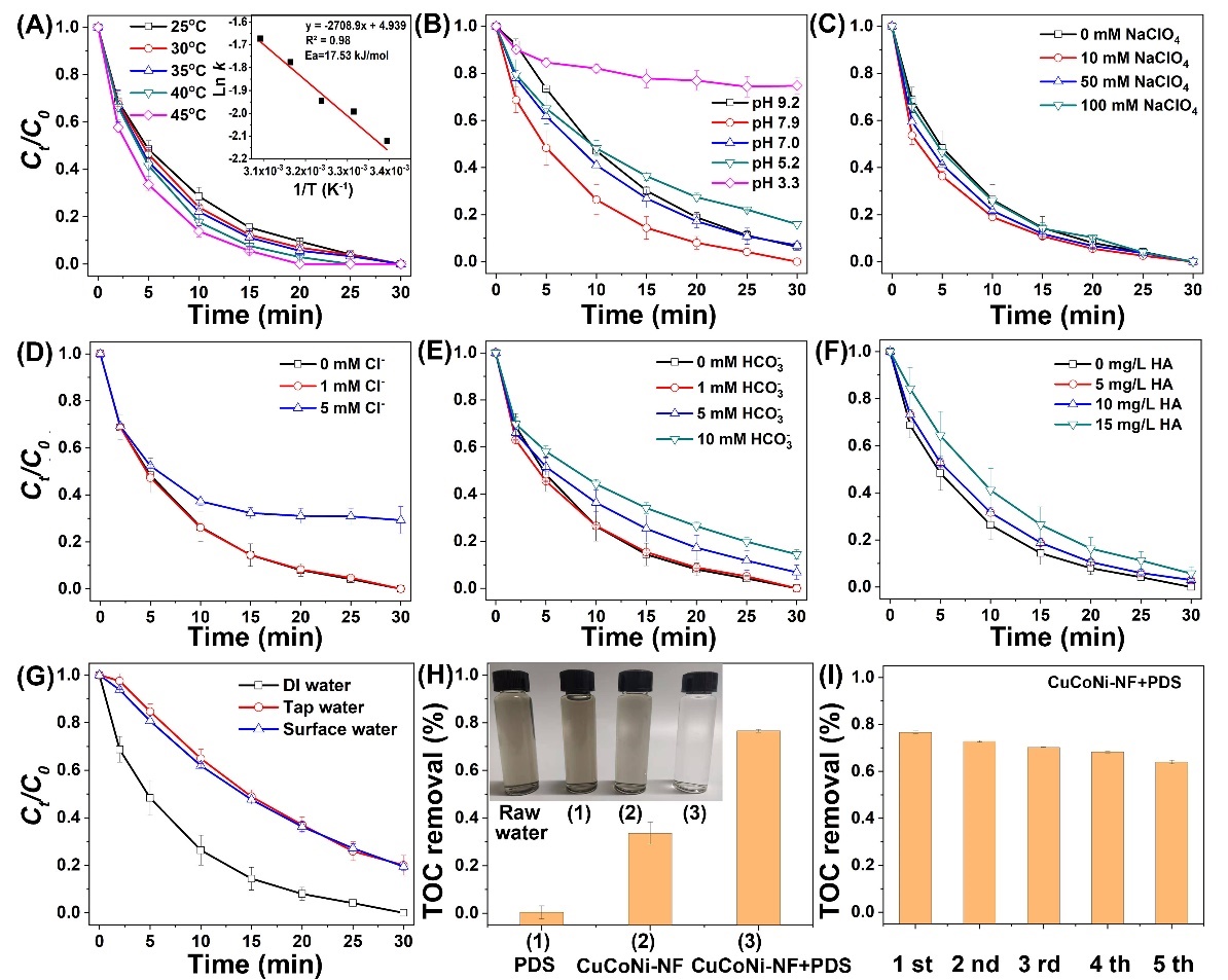 Figure 6. Effects of reaction temperature (A), solution pH (B), NaClO4 (C), Cl− (D), HCO3− (E), humic acid (F) on BPA degradation in CuCoNi-NF/PDS system; BPA degradation in actual water environments (G). TOC removal and chroma elimination of packaging wastewater in different reaction systems (H); TOC removal efficiencies of packaging wastewater for 5 cycles in CuCoNi-NF/PDS system (I).