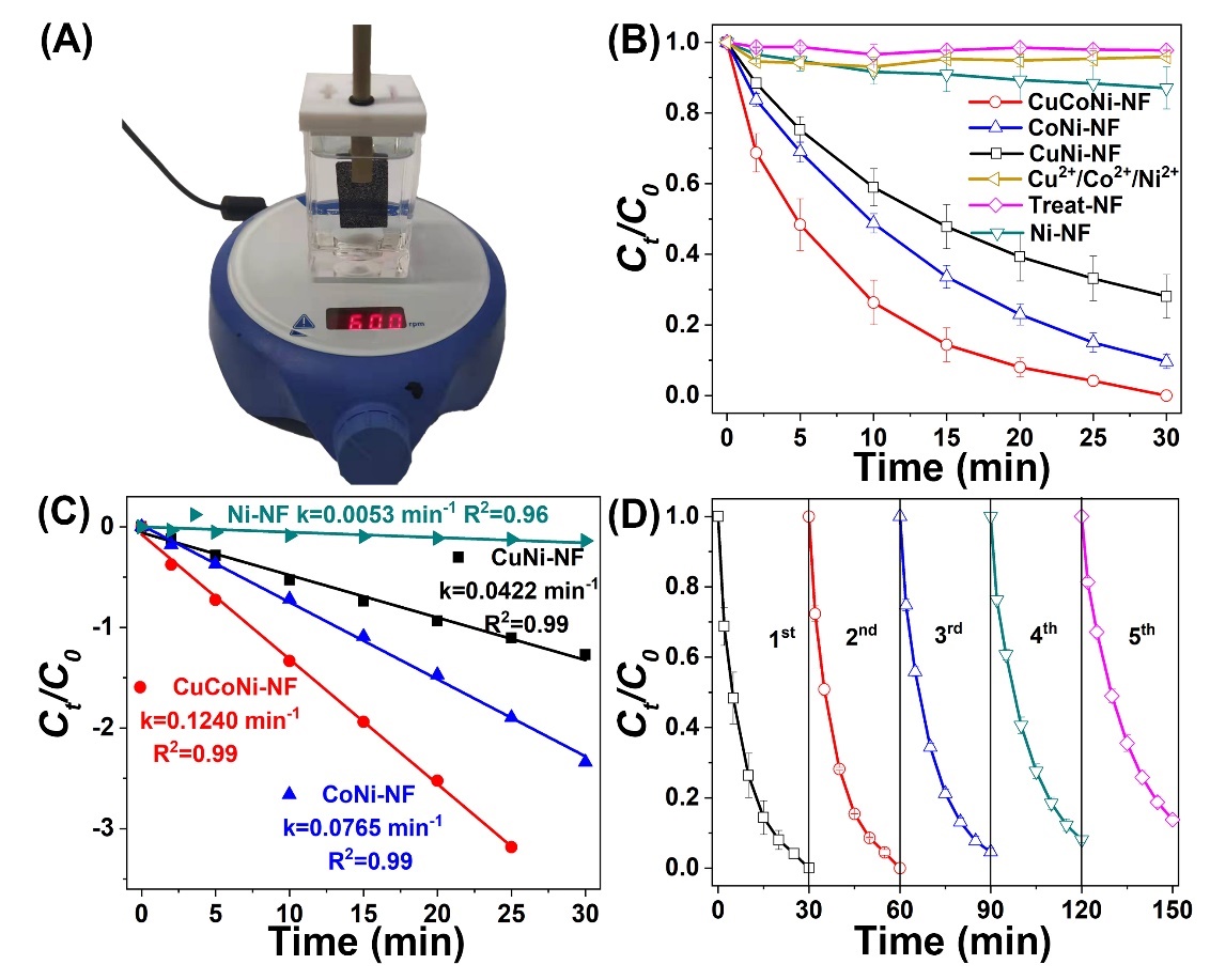 当使用CuCoNi-NF催化剂时,双酚A(BPA)在30分钟内的去除效率达到100%,高于CoNi-NF(76.5%)、CuNi-NF(62.8%)和Ni-NF(15.5%)。伪一级动力学拟合结果显示,CuCoNi-NF降解BPA的动力学常数k值为0.1240 min-1,高于CoNi-NF(0.0765 min-1)、CuNi-NF(0.0422 min-1)和Ni-NF(0.0053 min-1)。降解实验结果表明CuCoNi-NF催化活化PDS的性能最佳。催化剂循环使用结果表明,CuCoNi-NF具有良好的稳定性,在4次循环使用后仍保持对BPA高于90%的降解效率。