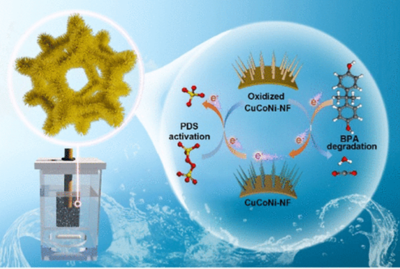 针对过硫酸盐活化过程中粉体催化剂分离和回收困难的问题,研究以NF为基底,通过在其表面原位生长多金属CuCoNi氧化物纳米线,构筑了一种新型固定化CuCoNi-NF催化剂。NF不仅为纳米线原位生长提供载体基底,还为金属氧化物合成提供内部镍源。该催化剂具有良好的PDS活化性能,可以有效抵抗水环境中的背景阴离子和有机质干扰,且易于分离和重复利用。CuCoNi-NF催化剂介导了污染物向PDS的电子转移,是典型的非自由基活化过程。研究结果为固定化催化材料的设计及在过硫酸盐活化中的应用提供了新的思路。