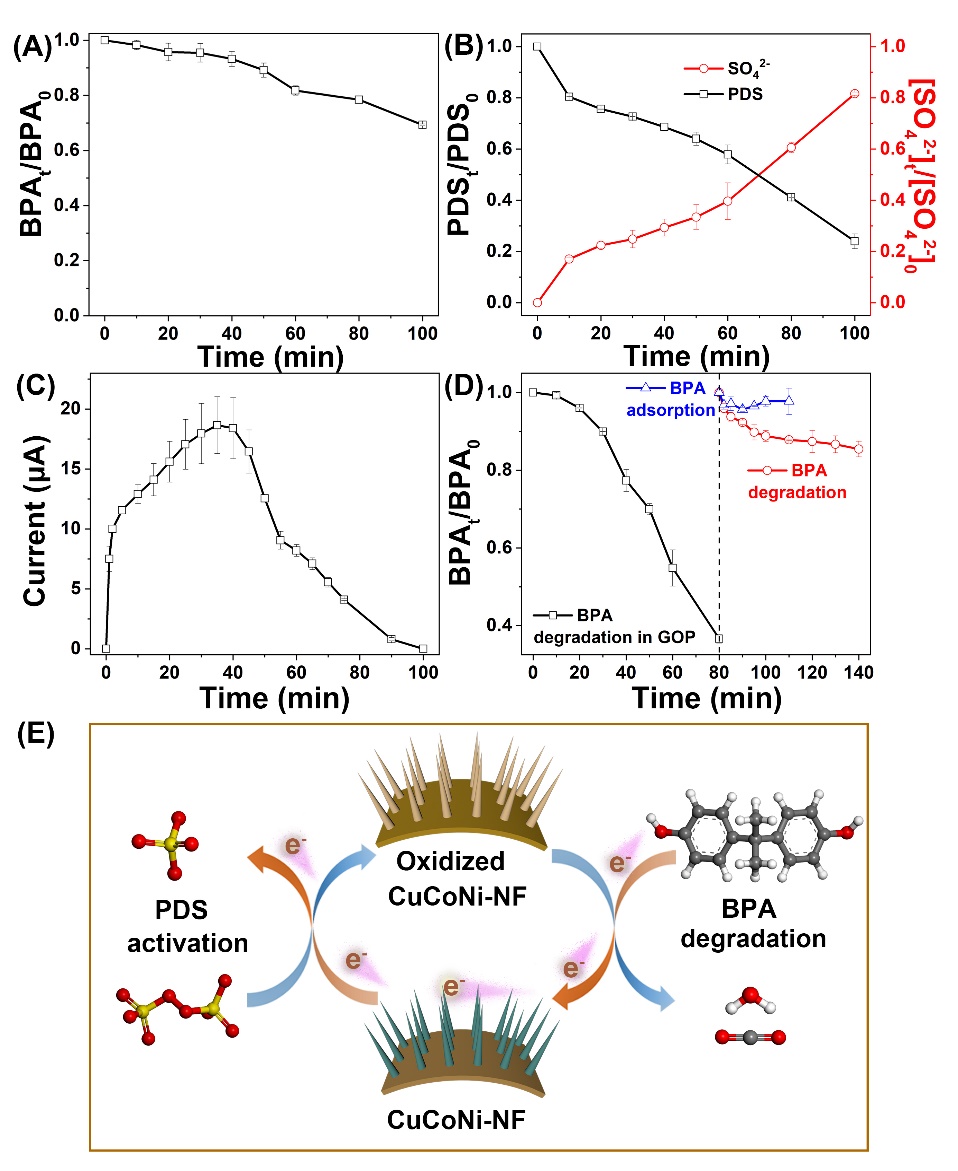 为进一步验证电子转移过程,我们构建了电化学氧化系统,将BPA和PDS分别置于两个半电池中。当连接两侧的CuCoNi-NF电极时,电子从BPA室不断转移至PDS室,系统产生明显的电流,在这个过程中BPA被氧化分解,而PDS转化为SO42-,证明了BPA通过CuCoNi-NF电子介导体向PDS转移电子。此后,我们将BPA室的CuCoNi-NF电极(未与PDS接触)置于新鲜的BPA溶液中,发现BPA在没有PDS存在的情况下发生分解,该结果进一步表明氧化态CuCoNi-NF可以从BPA夺取电子,CuCoNi-NF在PDS活化过程中介导了电子的转移。