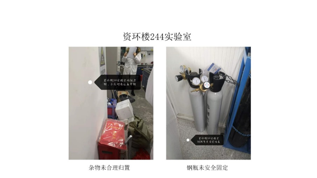 本次检查中几乎所有学生办公室和实验室都存在着大大小小的安全隐患,其中最差学生办公室是资环楼366室,最差实验室为资环楼448室。检查中发现最普遍的问题仍旧是堆放杂物,其他明显的问题有钢瓶未安全固定,实验台物品摆放乱等,极个别实验室带入食物的现象。
