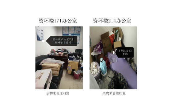 在本次检查的所有学生办公室中,资环楼331室得分最高,资环楼366室得分最低。本次办公室检查主要的问题为杂物堆放和违章电器。