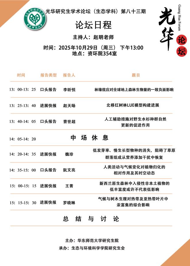 2025年10月29日下午13:00,成人用品 第83期研究生光华学术论坛(生态学科)在资环楼354室顺利举行,本期论坛由赵明老师主持,点评嘉宾为陈迎老师和宋月青老师。