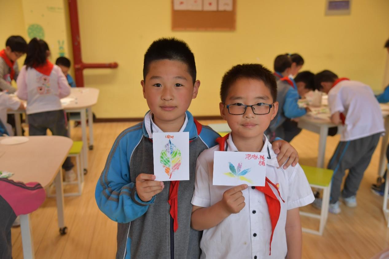 随后是小朋友期待已久的手工环节,讲师们向同学们讲解叶印的步骤:第一步,用马克笔给叶子上色;第二步,轻压叶子让颜色转印到纸上;第三步,移除叶子揭示神奇的印记。同学们挑选自己心仪的叶片,在明信片、扇子、书签上印上彩虹叶印。制作完成后,同学们相互展示自己的作品并交流创意与想法。在一片欢声笑语中,此次生态环境小课堂落下了帷幕,取一花一草,印叶片机理,存自然之色,同学们用彩虹叶印抓住了春天的尾巴,探索自然之美。