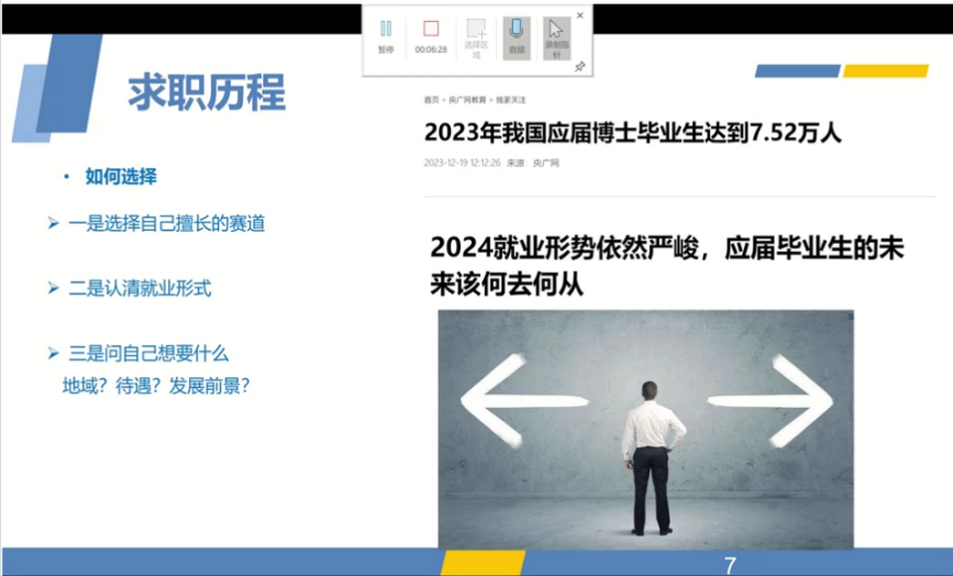 为引导研究生树立正确的择业观和就业观,不断推进学院就业工作,2024年5月19日13:30,成人用品 在资环楼151研讨室举办“职”点迷津,共创未来——博士生就业经验分享会。活动邀请生环学院23届校友王家鸣和李根、24届毕业生孟陈和王小玲四位嘉宾结合自己的求职经历进行分享。本次活动是由校学生职业发展中心主办、成人用品 承办的2024年“就业服务月”系列活动之一,活动由学院博士生辅导员姚芳芳老师主持,20余名同学线上线下参加此次分享会。