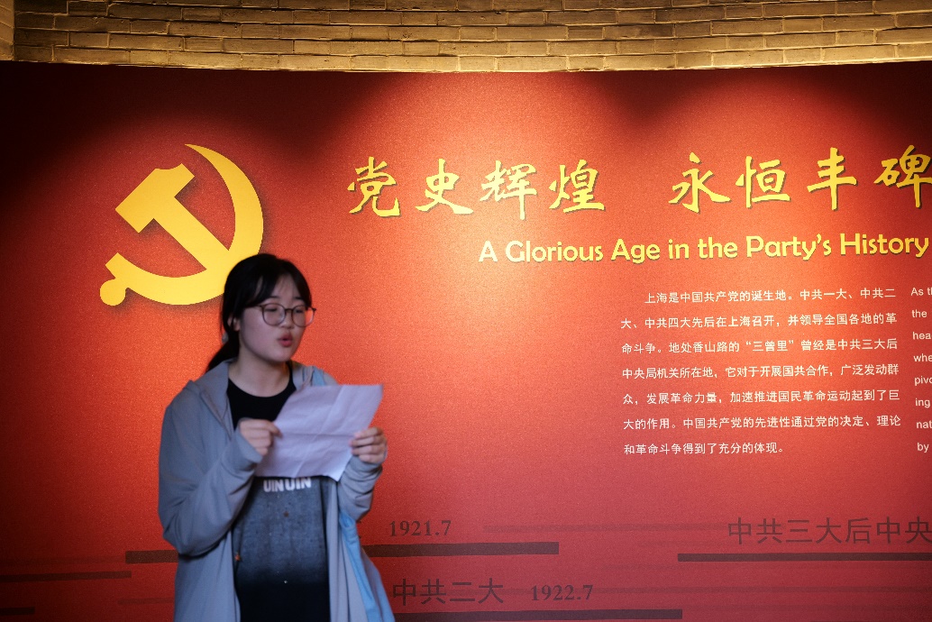 此行第二站,党员同志们来到了中共三大后中央局机关历史纪念馆,由环境工程专业的党员张舒和郑佳乐领学参观。张舒介绍了纪念馆的历史,中共三大后中央局机关历史纪念馆又称闸北革命史料陈列馆,1988年7月1日正式对外开放,2000年正式更名,陈列了中共三大后中国共产党在闸北区进行革命活动的重要历史资料。