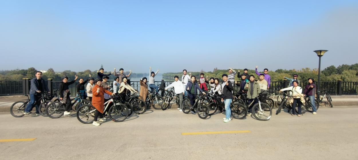 次日上午,阳光明媚,空气清新,骑行活动正式拉开帷幕。老师们个个精神抖擞,佩戴好装备后,沿着蜿蜒的湖边绿道有序出发。沿途秋景如画,火红的枫叶、金黄的银杏交相辉映。大家时而并肩疾驰、畅谈工作与生活的点滴,时而放慢车速、沉醉于沿途的自然风光,在运动中释放压力,在协作中增进情谊。骑行路上,遇到陡坡时的携手相助、体力不支时的相互鼓劲,让团队的凝聚力与向心力在不知不觉中悄然提升。