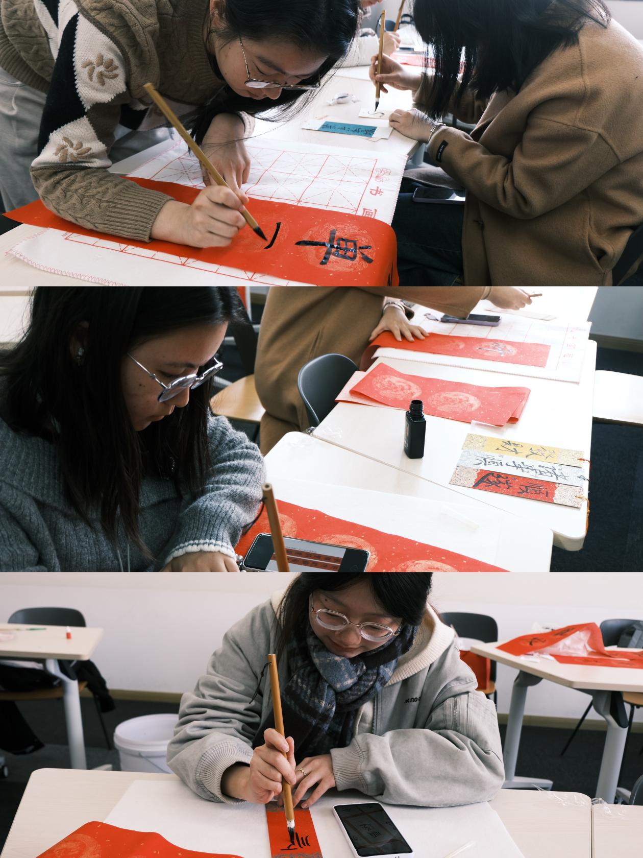 对联DIY环节同样精彩。活动现场,笔墨纸砚早已摆放整齐,同学们挥毫泼墨、切磋技艺,书写对新年的美好祝福。既有“瑞雪兆丰年”“春回大地暖,福满人间春”等传统佳对,传递对家国昌盛的祈愿;亦有“绿水青山生态美,人与自然和谐生”等结合专业特色的创新之作,展现了生态学硕士对生态文明建设的专业情怀与责任担当。创作期间,现场洋溢着浓郁的传统文化氛围。