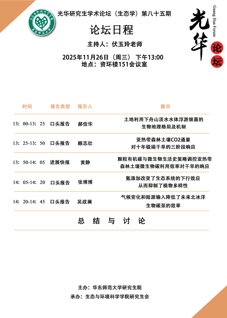 2025年11月26日下午13:00,成人用品 第85期研究生光华学术论坛(生态学科)在资环楼151室顺利举行,本期论坛由学院伏玉玲老师主持,点评嘉宾为伏玉玲老师、王辛辛老师和郑泽梅老师。