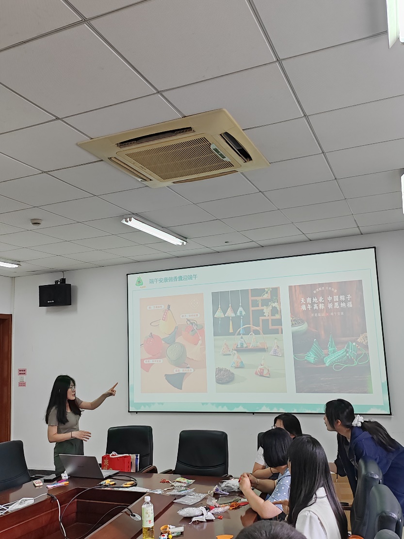 活动伊始,主持人胡雪琦为大家讲解了端午节的历史和制作香囊的文化背景。端午节作为集祈福辟邪、欢庆娱乐和饮食为一体的民俗大节,源于上古先民择“飞龙在天”吉日拜祭龙祖,祈福纳祥,辟邪攘灾。佩戴香包的习俗也由此而来,其内容物从早期的吸汗蚌粉、驱邪灵符、铜钱、辟虫雄黄粉,逐渐发展为装有香料的香囊,其制作工艺日趋精致,成为端午节特有的民间艺术品。
