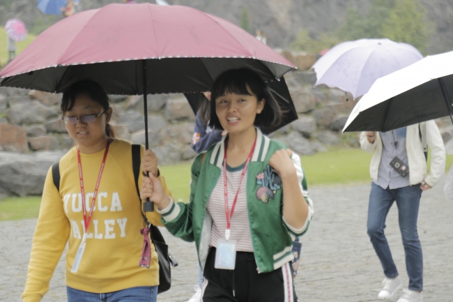 同学们“成双成对”地漫步在细雨中