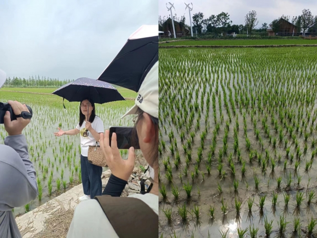 我们还对竹小汇低碳智慧农田示范项目进行了调研,在此我们对如何减少化肥施用量进行了探讨,了解了“沼液还田”等举措;在田边还设有生态沟渠,沟渠中生长着大量水生植物,用于对农田退水中的污染物进行吸收,进而实现尾水减碳排放;在田块之间,还设有由秸秆铺成的田间小道,对于秸秆,我们还思考了秸秆的资源化利用,可制备生物炭、堆肥等资源。最后我们进行了稻田甲烷减排的思考,如何采用措施阻止甲烷的产生,是否可以通过调控稻田中的微生物菌群来实现等。