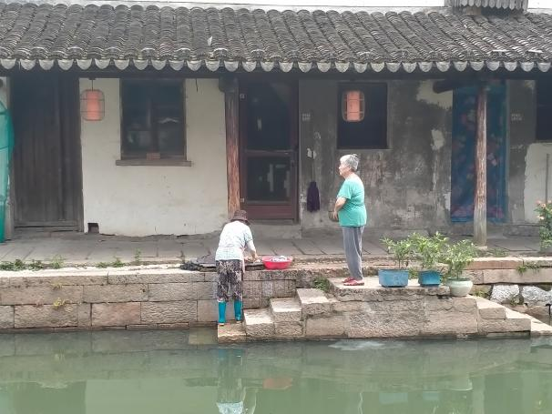 进入黎里古镇,映入眼帘的是贯穿整个古镇的主河流,仔细观察发现河道中间有一根白色管道,询问当地村民,我们了解到这根管道的主要目的是曝气充氧,在发生大降水或河道水质恶化时给水体补充氧气,增强水体降解污染物的能力。继续行进便看见了在黎里古镇河边洗衣服的当地村民,但在有外部污染物进入的情况下黎里古镇河流仍能保持良好的水质,水中不时有小鱼来回游动,说明该水体有较强的自我净化和调节能力。