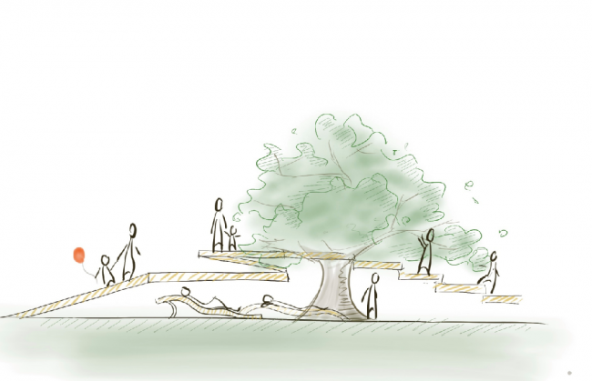 在自然场所中搭建不同高度的平台,并用坡道连接,人们可以根据所在的不同高度近距离接触植物的不同部分。根据季节变化也可以有不同的活动,从而收获不一样的体验。这有异于常见公园中人与自然有强烈割裂感的情况,人们参与到自然中,像自然中生长的每一个动物植物一样依赖自然。
