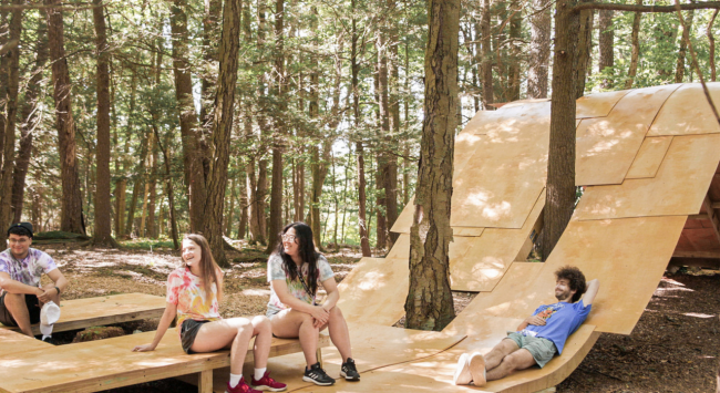 这种结构的合理性在于它能够塑造多样化的舒适体验:拱形结构为表演者创造了演奏的“壳”;分层的甲板成为观众座位;像素化的表面为透过树梢洒下的光阴提供了起伏的画布。它的形式灵活,适用场所多样,可以结合本土材料与当地环境进行很好的融合。