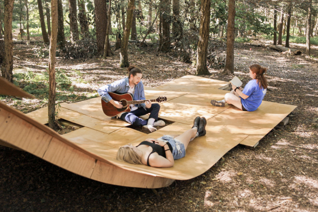 这是由一系列连续的木层压板拱结构与板结构组成的大地装置,形成了一个可以用于展览或表演的灵活空间。木层压板方案由超过 60 片约 6 毫米厚的胶合板组成,这些胶合板经过弹性变形处理后层压在一起,形成像素化的弯曲拱形结构。木层压板由数字方式构建而成,以模仿木材的自然弯曲状态,每六块木层压板组合形成一个“波浪”形态。它完美地嵌入了景观中,被森林植物群包裹着,似乎早早就存在于此,待人发现。