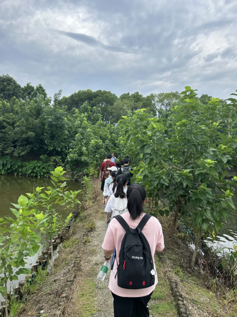 7月6日,实习队伍来到浙江省湖州市南浔荻港村桑基鱼塘考察。在湖州蚕桑首席专家楼黎静老师的带领下深入了解了该地桑基鱼塘生产模式。