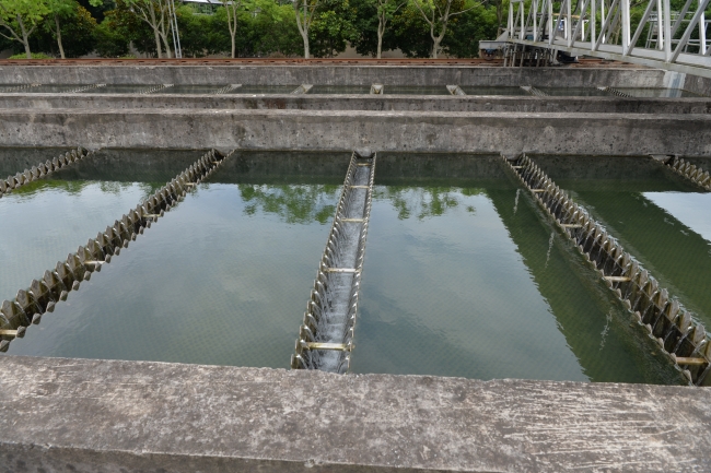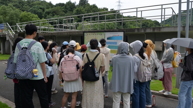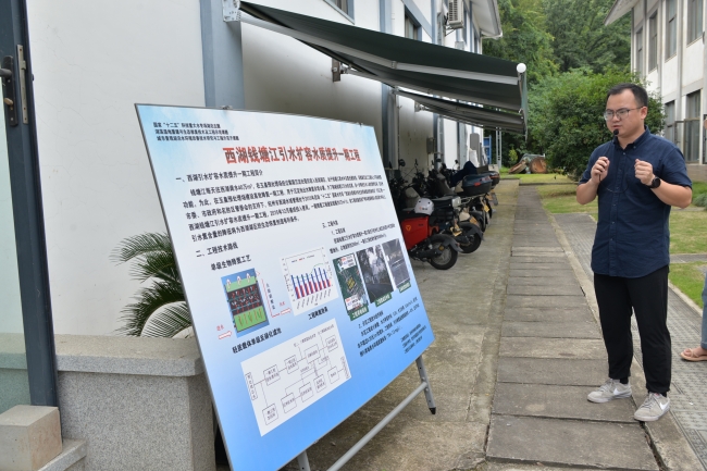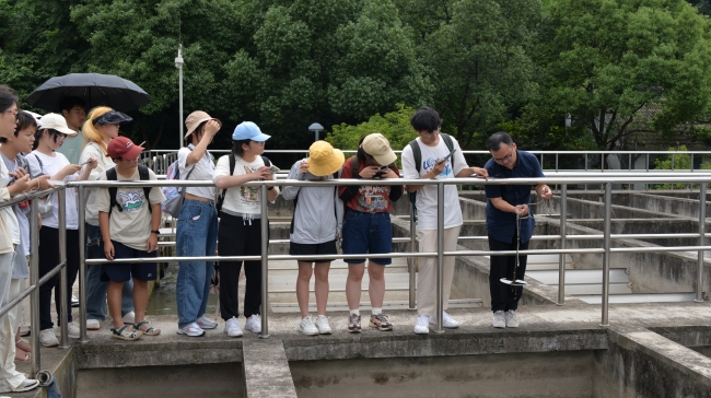 下午,师生们乘车到达玉皇山引水预处理场,考察西湖引配水与降氮工程。紧跟水厂管理负责人潘老师的脚步,同学们实地学习了水处理工艺混合、絮凝、沉淀的三个环节,直观地感受到浑浊的原水逐渐变为清澈的过程。再进入到降氮工程构筑物内部,进一步了解轻质载体单极反硝化滤池降氮工艺的原理,深入理解引水降氮工程在西湖水质全面提升过程中的重要作用。