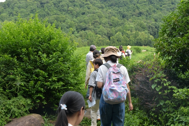 然而茶产业背后的生态环境问题也不容忽视。在茶博门口的茶园现场,陈雪初老师介绍了茶叶种植面源污染及周边餐饮废水的排放,曾一度导致龙泓涧生态环境恶化。龙泓涧水生态修复工程解决了面源污染问题,其最大特点便是“因势利导”,利用生态修复技术对自然水体进行净化和改善,采取基于自然的解决方法而非大规模工程施工让古老的茶园重焕生机。