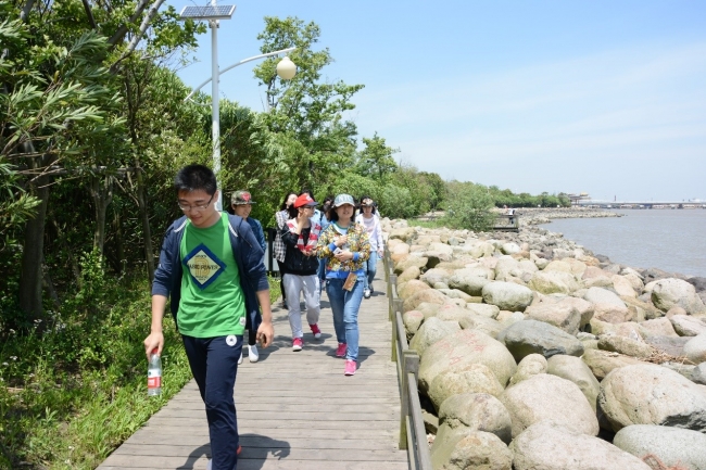 10日上午7:45,参加实践活动的师生们在资环楼楼下集合,一同乘坐大巴前往吴淞炮台湾湿地森林公园。该公园位于上海市宝山区,东濒长江,西倚炮台山,总面积120万平方米,其中陆域面积60万平方米,原生湿地面积60万平方米,沿江岸线约2000米。