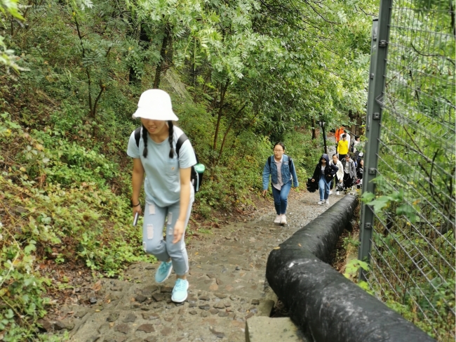 下午三点自由参观结束后,同学们共同前往辰山。辰山属于佘山山系,海拔约70米 。明代董其昌记载,辰山“在诸山之东南,次于辰位”,也以此得名。20世纪由于采石,山的南坡已被削去。在植物园的设计中,这一部分被改造成为矿坑花园。矿坑花园的原址为一处采石场遗址,设计者通过生态修复,并对深潭、坑体、迹地及山崖进行适当的改造,使其成为一座风景秀美的花园。