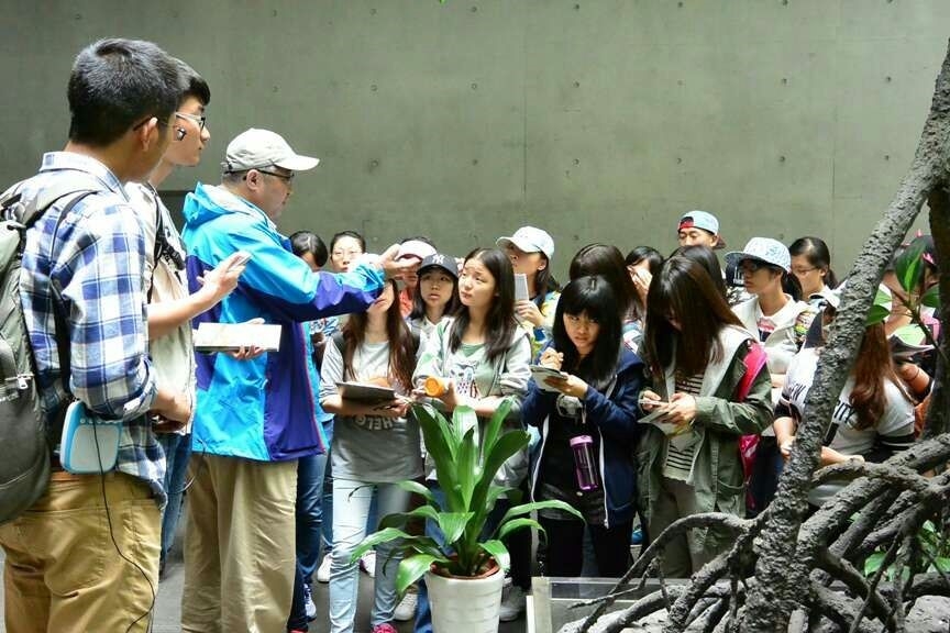 达良俊老师在中国湿地博物馆内给学生讲解红树林根结构