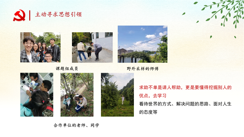 张瑜同学分享的主题是“思想引领的重要性”。她从习近平总书记在庆祝中国共产主义青年团成立100周年大会上的讲话出发,谈到新时代中国青年不可避免的会面临各种思潮的现实影响,会遇到各种思想困惑,需要更加细致的教育和引导。正确的思想引领可以帮助青年观察社会、用清醒的头脑思考人生、用智慧的力量创造未来。研究生在求学过程中会遇到各种各样的困难,我们需要主动向导师、课题组的同学以及周边的其他朋友寻求帮助,并向他们学习看待世界的方式、解决问题的思路、面对人生的态度等,使自己不断提高。