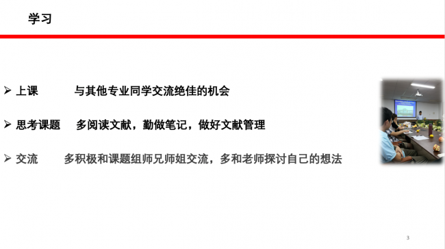 纪宇皝同学分享了自己的毕业感悟。内容分为三个部分:学习、活动和求职。他说在博士阶段,最重要的是要学会与他人交流,善于交流能让自己的课题进展地更顺利。同时,通过上课与其它专业的同学沟通交流也能够给自己带来不同的经验和感悟。另外,他认为在闲暇时间要多提升自己方向的专业技能和分析能力。其次,纪宇皝同学分享了自己在党支部工作中的经历和业余运动方面中的经验,他认为多参与团体活动可以锻炼合作意识,强健体魄,为科研工作打好基础。最后,他分享了自己的求职经历,鼓励大家多去尝试,要自信,勇于突破自己的舒适区才能有更好的突破。