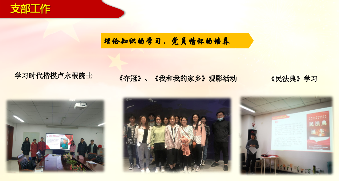 活动的第二部分是毕业生党员交流会。慈航同学结合科研和党支部工作的收获,拟定的分享主题为 “不忘初心,砥砺前行”。对于科研,她分享了四点心得:一是科研兴趣,兴趣是最好的老师,热爱科研才能快乐地坚持下去;二是选好研究话题,尽早把关键技术和方法学会,开展实验;三是要集中时间看文献,多看文献;四是要多参加学术活动,积极展示自己的研究成果,多多交流。第二方面,她分享说支部活动和支部工作可促使大家成长,党支部活动可以加强理论知识学习,培养党员情怀,坚定党员信念。她鼓励大家积极参与支部的工作和活动,这样能得到更好的锻炼和成长。最后她希望大家都不忘入党的初心,不忘科研的初心,不忘读博的初心,勇敢向前走!
