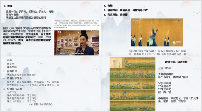 在《只此青绿舞绘千里江山图——走近中国传统文化》中,丁媛媛老师从春晚舞蹈《只此青绿》引出舞蹈诗剧《只此青绿》,跟随展卷人的视角跨越时空走入画家的内心,大家一起徜徉在富有传奇色彩的中国传统美学意趣之中。随后,丁老师详细介绍了舞蹈背后的千古名画《千里江山图》,作品以长卷形式,作者以绚丽的色彩、高超的绘画技艺描绘了连绵的群山和浩渺的江河湖水,展现了山河的雄伟壮阔,是存世青绿山水画中最具代表性和里程碑意义的作品。然而这样的传世杰作却通篇没有作者的款印,只有从卷后题跋和其他史料中知晓作者为王希孟,但这位天才少年英年早逝,这幅图也是其唯一的传世作品。通过舞剧《只此青绿》,让观众看到了宋代工艺技术的登峰造极,同时也向全世界展示了中华民族的文化瑰宝。这让我们更加热爱中华传统文化,并为之自豪自信!
