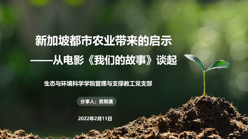 2022年2月11日下午,生环学院管理与支撑教工党支部举办第二场寒假学习分享主题活动,分享人是欧阳澳、丁媛媛、束亚男、杨庆松老师和施天慧同学。欧阳澳老师分享的主题是《新加坡都市农业带来的启示——从电影<我们的故事>谈起》、丁媛媛老师分享的主题是《只此青绿舞绘就千里江山图——走近中国传统文化》、束亚男老师分享的主题是《坚定四个自信,砥砺奋进——<厉害了,我的国>观后感》、杨庆松老师分享的主题是《北京冬奥会中的文化、科技和中国青年》、施天慧同学分享的主题是《京剧与传承》。