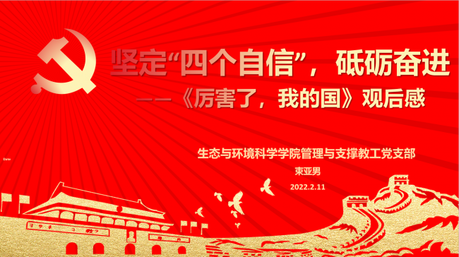 在《坚定“四个自信”,砥砺奋进——观<厉害了,我的国>有感》中,束亚男老师分享了寒假期间观看的纪录片电影《厉害了,我的国》的观后感。一个个非凡的超级工程,引领崭新的强国时代;而一幅幅家国画卷,则讲述着每一个平凡人的努力。中国桥、中国路、中国港、中国车、中国网、中国梦……这些带着时代体温的镜头和语言,如同一幅瑰丽的鸿图,精彩绝伦地展现在观众面前,大国雄姿跃然眼前!作为新时代的见证者、建设者,同时也是幸福时代的受益者,我们见证并参与着国家的高速发展,享受着国家提供的和平自由的生活、工作的环境。现在是前进上坡的时代,是国人砥砺奋进、开拓进取、不断创新的时代。以史为鉴,可以知兴替。不忘初心,方得始终,增强“四个自信”,传承英雄先烈的遗志。回顾党的光辉历程,坚定道路自信!众志成城,抗击疫情,“中国之治”和“西方之乱”形成鲜明对比,制度优势进一步彰显,坚定制度自信!五千年文明历史淬炼的文化精神,在新时代传承贯彻,“两弹一星精神”、“航天精神”、“抗疫精神”推动伟大事业改革和走向胜利,坚定文化自信。中国梦,触手可及,牢记使命,砥砺前进。