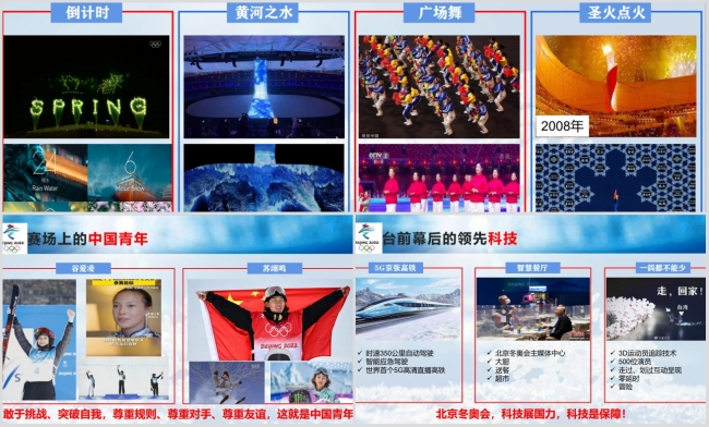 在《北京冬奥会中的文化、科技和中国青年》中,杨庆松老师根据2022年北京冬奥会开幕式和一周来的比赛实况,围绕“文化”“科技”和“中国青年”三个方面讲述了冬奥会台前幕后反映的中国发展故事。北京冬奥会的开幕式简约而美丽,24节气倒计时,“黄河之水天上来”,以及微型、低碳的奥运圣火点火仪式令人印象深刻,相比于2008年北京夏奥会的文化盛宴,2022年北京冬奥会更是充分展示了中国人的文化自信。北京冬奥会还具有满满的科技感,5G智能的京张高铁、无人智慧餐厅、一“鸽”都不能少节目中的AI技术等等,科技成为北京冬奥会成功举办的强大保障,开幕式表演的成功和运动员一次次打破奥运记录则是充分证明。杨老师还以17岁的苏翊鸣、18岁的谷爱凌,两位未及弱冠的中国年轻人,在北京冬奥会上用他们神勇的表现、开放的心态,向全世界展示着中国青年热情开朗、包容进取的形象。冬奥会是个国际舞台,一届成功的冬奥会,将很好地展示民族的文化、科技的发展和人民的精气神,是最真实的国家发展写照。