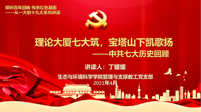 管理与支撑教工党支部开展中共七大和中共八大历史回顾微党课,本期讲读人为丁媛媛和柳欣源,支部全体党员和十余名学生党员参加,共同学习并铭记这段党的非凡历史,从先辈在艰苦岁月中仍然充满信心斗志昂扬的精神中汲取能量,努力奋斗不断前进。该系列活动结合“百年跨越对话红色经典”校园主题活动日暨经典阅读季开展,微党课讲读结合《从一大到十九大:中国共产党全国代表大会史1921-2017》等书籍开展。