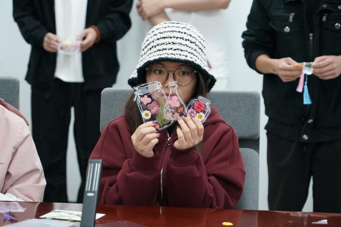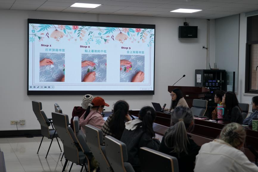 活动现场,桌面上整齐地摆放着各种经过脱水处理的干花以及精美的双层书签材料。由王英桥同学为大家详细讲解了押花书签的制作步骤,并展示了多款精美的成品示例,为同学们提供了丰富的创作灵感。