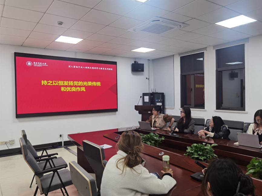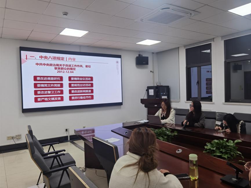 会议第二项,景婷婷和朱颖璨同学围绕中央八项规定的核心要求、典型案例及历史脉络带领支部党员展开学习,强调落实全面从严治党要求、加强党风廉政建设的具体要求。通过学习,让党员深刻认识到,中央八项规定不仅是一场作风革命,更是全面从严治党的重要切入点,对于密切党群关系、净化政治生态具有深远意义。
