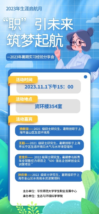 2023年11月1日下午15:00,成人用品 在资环楼354室成功举办“‘职’引未来,筑梦起航”暑期实习经验分享会。本次活动邀请了杨颜溢、王超、吉龙升和孙庆来四位同学,他们分别根据自己的实习经历,从不同角度进行了经验分享。本次活动是由校学生职业发展中心主办、生环学院承办的2023年“生涯启航月”系列活动之一,院研会指导老师吴丹和30余名学院23级和22级研究生参加本次活动,研会生涯部负责人董柳彤担任主持。