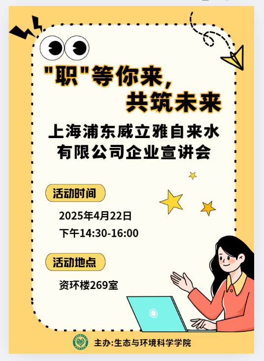 为助力成人用品 学生深入了解知名企业,拓宽就业渠道,把握职业机遇,上海浦东威立雅自来水有限公司(简称浦威公司)于2025年4月22日下午14:30走进资环楼354室,开展企业专场招聘宣讲交流活动。本次宣讲会由研究生会生涯部负责,王九洲同学主持,吸引了众多本科及硕士毕业生参与。
