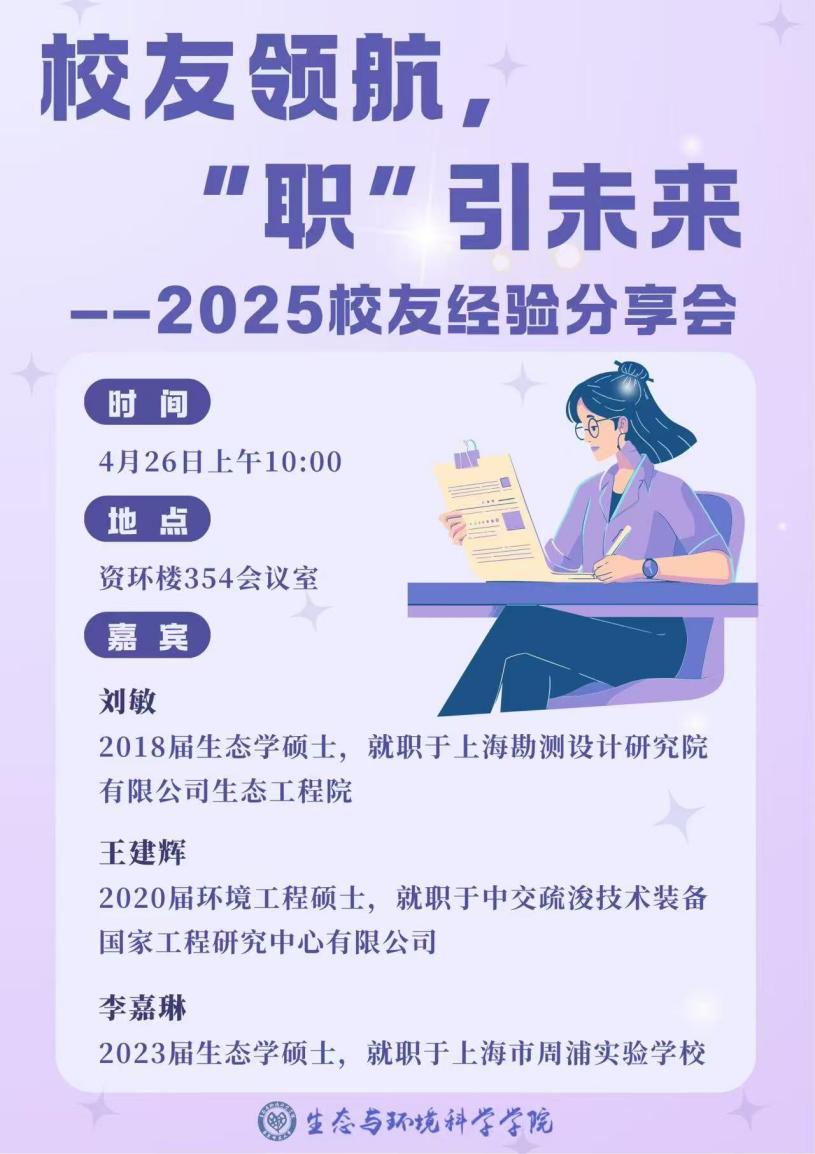 为助力同学们明晰就业态势、把握专业就业前景,确立科学的就业择业理念,合理规划职业发展路径,强化求职竞争力,2025年4月26日上午10:00在闵行校区资环楼354教室,成人用品 举办“校友领航,‘职’引未来——2025校友经验分享会”。活动邀请生环学院2018届校友刘敏、2020届校友王建辉、2023届校友李嘉琳三位嘉宾结合自己的工作经历和感悟进行分享。活动由院研会生涯部负责,王九洲同学主持,40余名同学参加此次分享会。