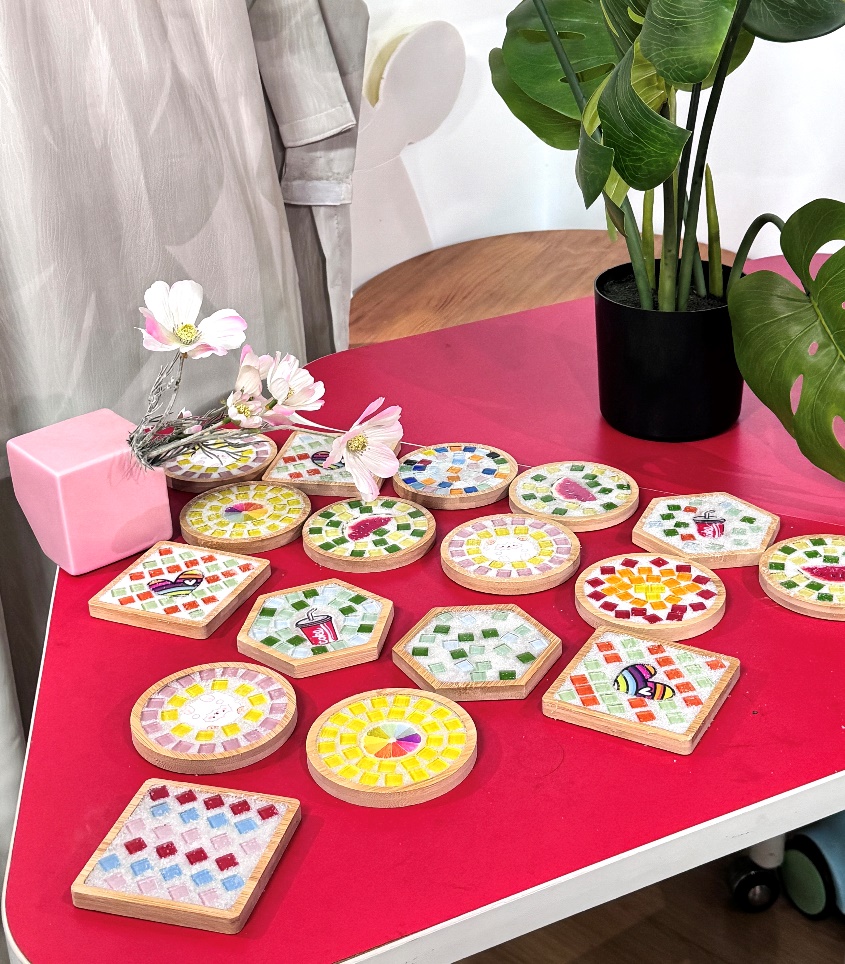 马赛克一词源于古希腊,原本是用镶嵌方式拼接而成的细致装饰,是一种表现图案装饰的艺术形式。摊位一希望同学们可以打破规则,对马赛克进行随意地拼接,做出来又实用又好看的专属杯垫。