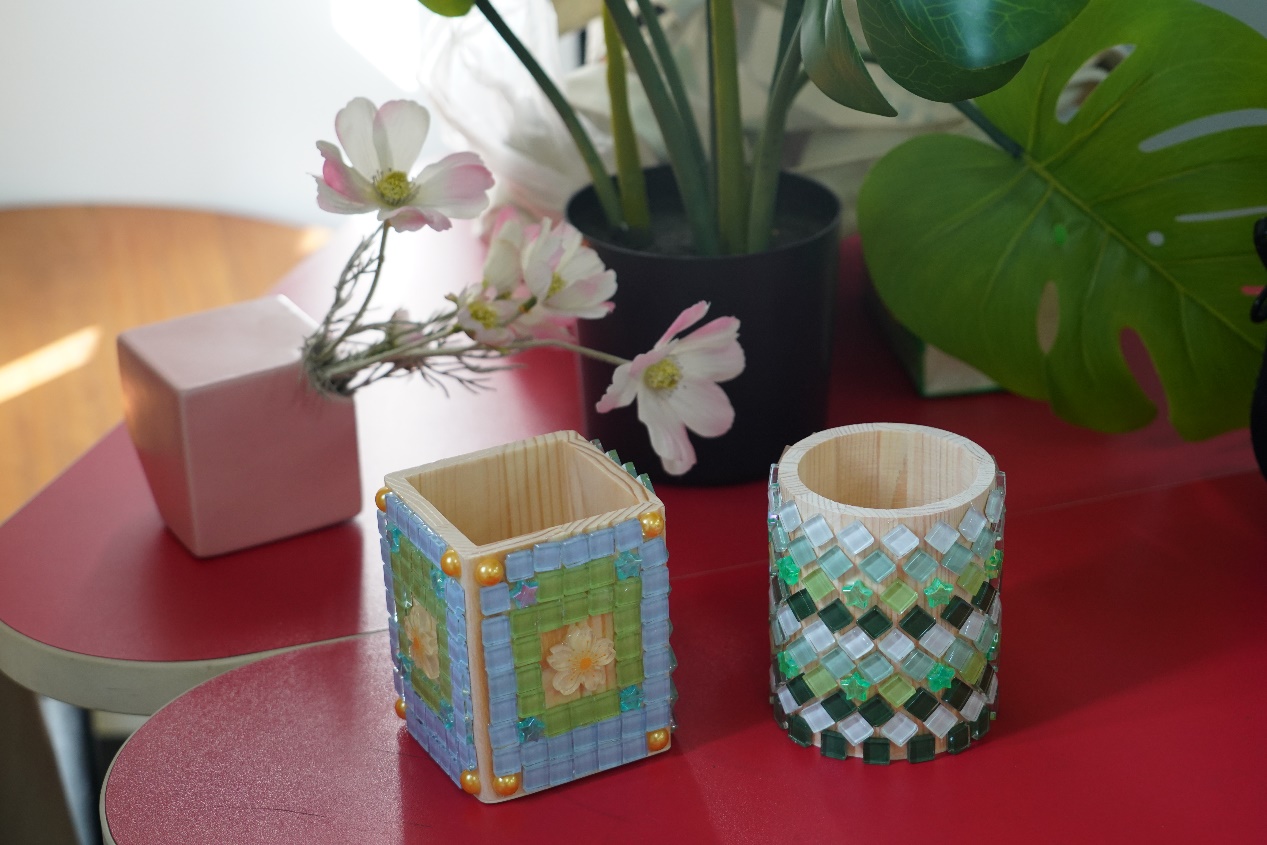 先把胶水均匀涂抹在笔筒底胚上,并依次粘贴马赛克,再使用填缝剂涂抹在马赛克缝隙中,最后擦拭干净就可以得到一个DIY专属笔筒啦。同学们纷纷发挥奇思妙想,大胆地进行色彩搭配与形状设计。制作的过程不仅锻炼了大家的动手能力,还激发了大家的创作思维,引导着大家去发现美、创造美。活动中同学们互相交流、互相帮助,也拉近了彼此之间的距离,增进了友谊,留下一段美好的回忆。