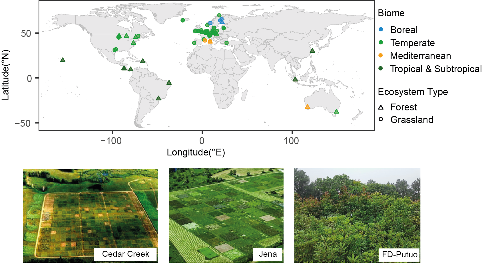 图1. 本研究所包括的全球BEF实验分布图以及部分实验总体图。三个实验样地图分别来自美国雪溪松(Cedar Creek)、德国耶拿(Jena)和本课题组位于浙江省舟山市普陀山的实验样地(FD-Putuo)