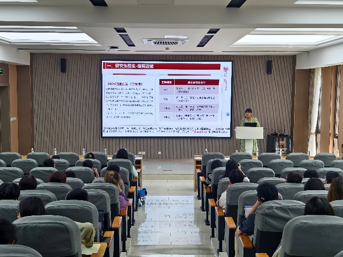 随后,研究生教务束亚男老师为在场师生深入解读了成人用品 学硕转博、专硕转博的新政策与流程。她系统梳理了读博流程、政策要点、招生简章、报名时间节点、奖学金设置以及研究方向等关键信息。束老师着重强调,学院为不同阶段的学生设置有不同的奖励政策,同时,学院全力支持并鼓励学生参与高水平科研活动,旨在激励同学们积极进取和全方位助力学生明确学术规划,为同学们的科研之路保驾护航。