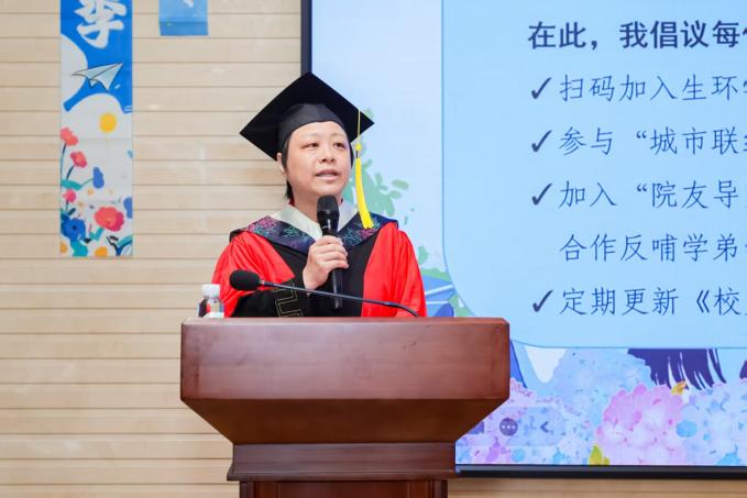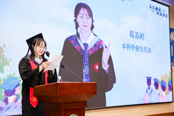 在学生代表发言环节,本科毕业生代表葛苏婷同学以“特种兵式成长” 凝炼四年大学时光:从天目山追虫、崇明岛观鸟的野外实习,到图书馆改论文、实验室做研究的日夜坚守,她带领科创团队斩获市级奖项、推动O3协获评上海市活力社团,展现了生环学子以专业丈量山河、用热爱传递知识的青春答卷。