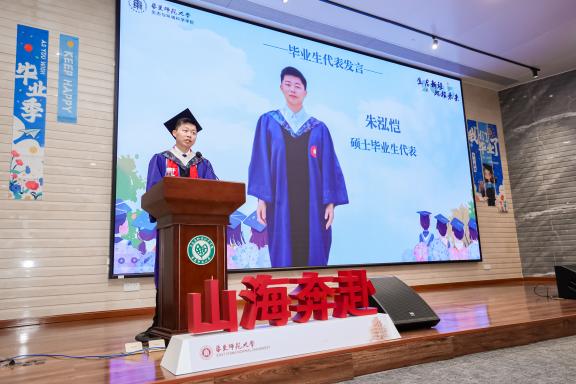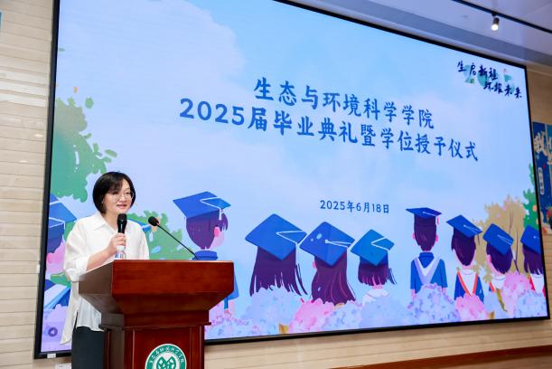 教授、博士生导师,教师代表黎绍鹏老师以双重身份深情致辞,他既是陪伴同学们成长的师长,也是20年前选择生态学专业的"大师兄"。他以自身从本科求学至投身教学科研的经历为引,向毕业生传递三重期许:永葆对生态环境的热爱,以温柔坚定之心守护脚下土地;以热爱为舟,在舆论纷扰中坚守初心,让热爱引领人生方向;勇敢拥抱身份转变,在生活的无标准答案里破茧成长。