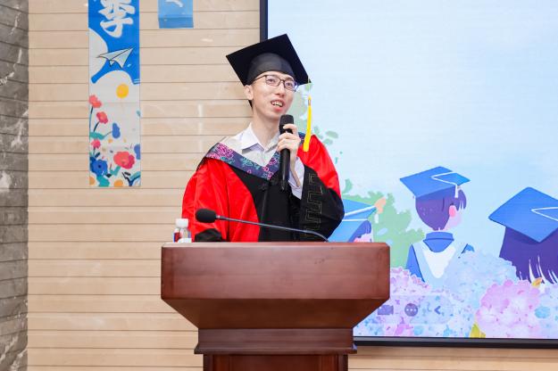 硕士毕业生代表朱泓恺,在发言中勾勒了求学生涯的“闪光图谱”:论文刊登时的欣喜、光华论坛演讲时的振奋、组织学院活动时的奋战、辩论赛场折桂时的骄傲,他亦坦诚科研路上数据颠覆预期的焦灼、报告遭到质疑的窘迫,将学术旅程比作“明暗交织的织锦”,坦言每个瞬间都在雕琢成长的肌理。