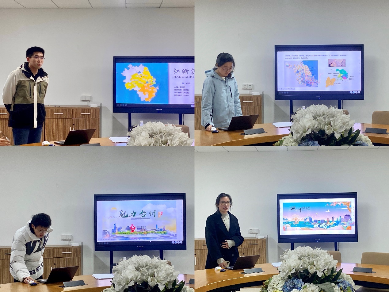第二组是来自包邮区的江浙沪的四位同学。来自上海的谢逸轩向我们分享了他的“魔道三见”;来自江苏的薛晨怡从“自然景观”“人文景观“多角度出发向大家分享了无锡的情况;来自浙江的卢正扬从视频切入,向大家展示了一个被誉为文化名城、园林城市、宜居城市、幸福城市的台州之美;来自浙江的包兴燕,向大家详细介绍了湖州的南浔古镇及莫干山等名胜古迹。